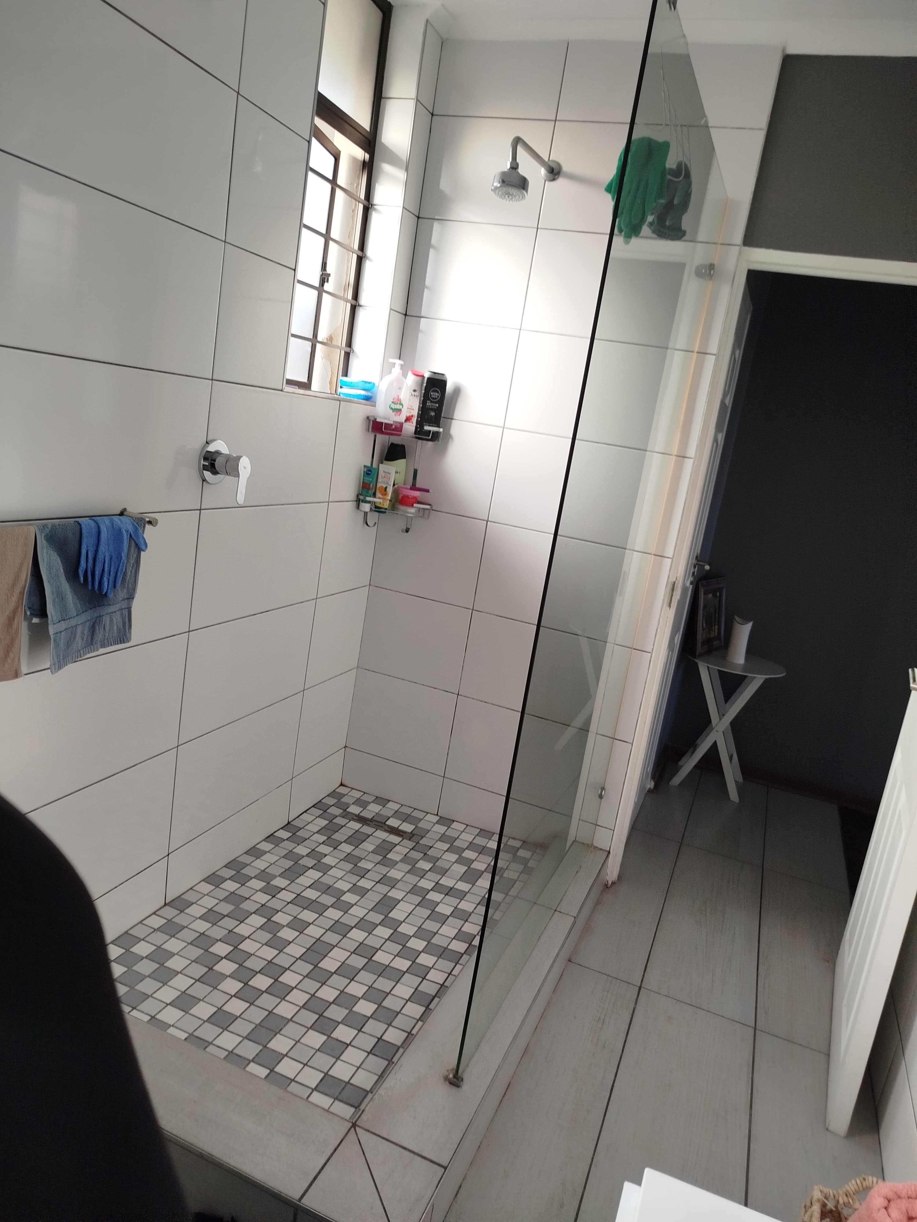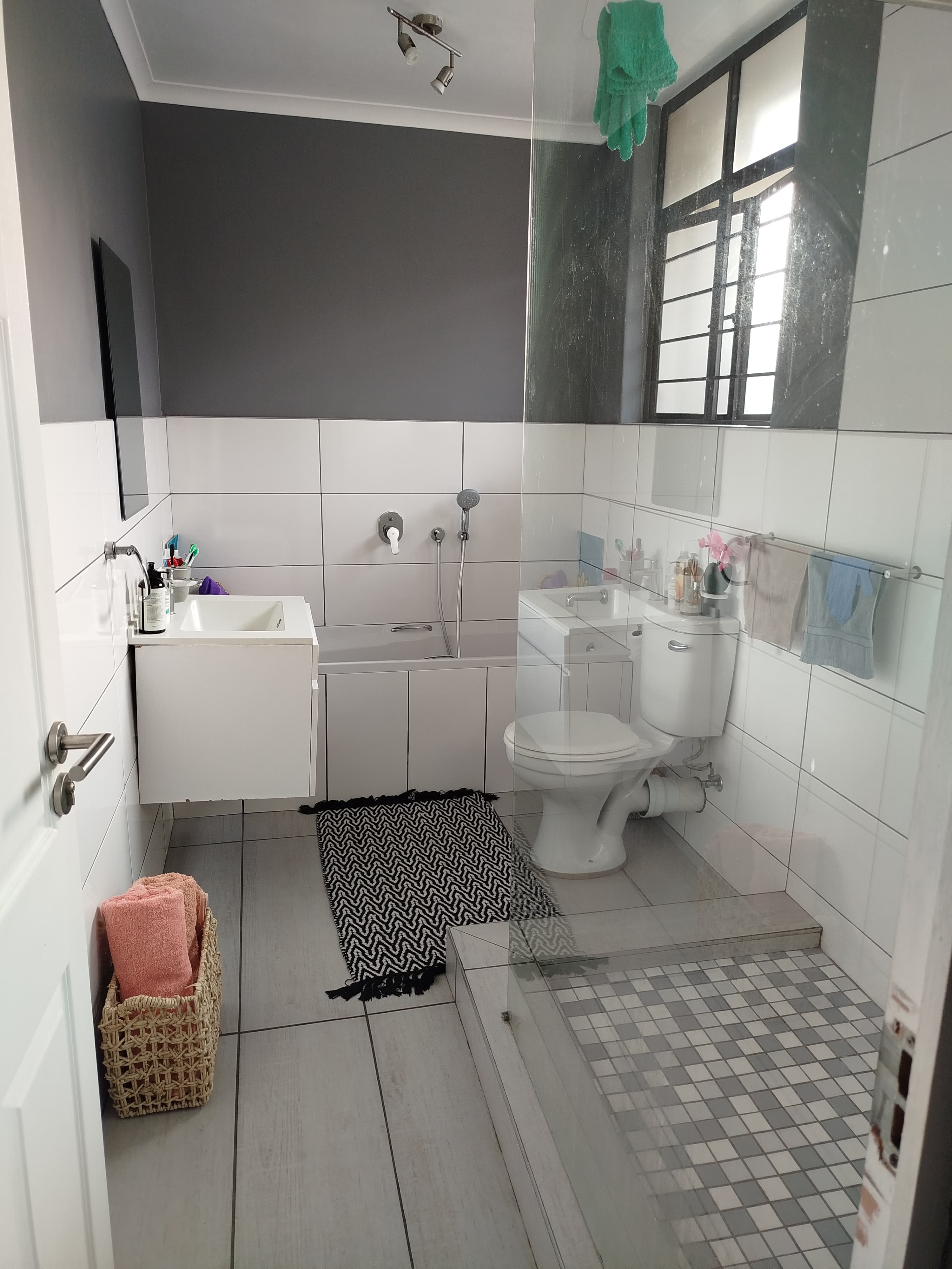 Bathroom with walk in shower, bath tub, basin and toilet.