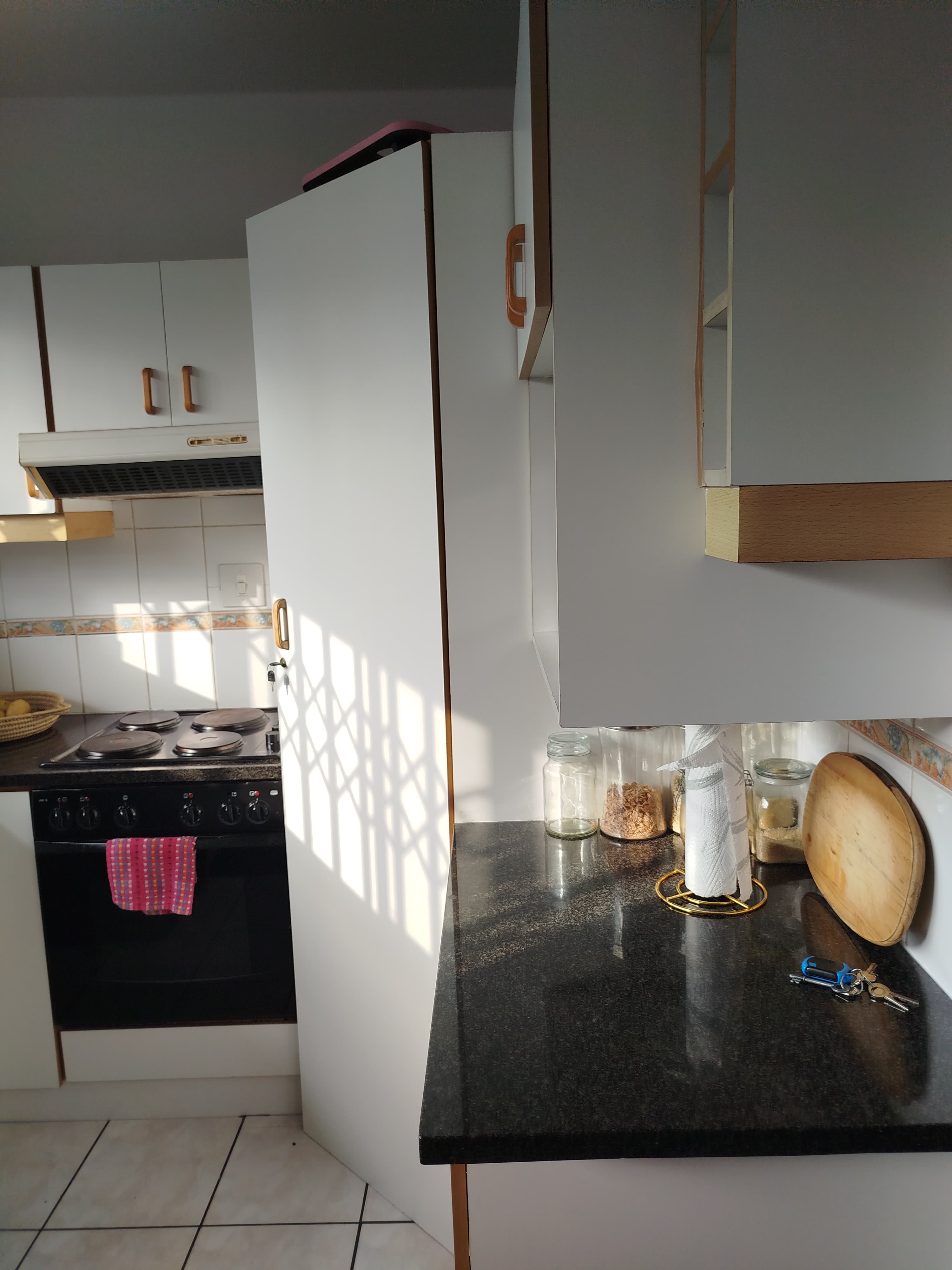 Fitted kitchen with granite counters, oven and hob and plumbing for a washing machine.